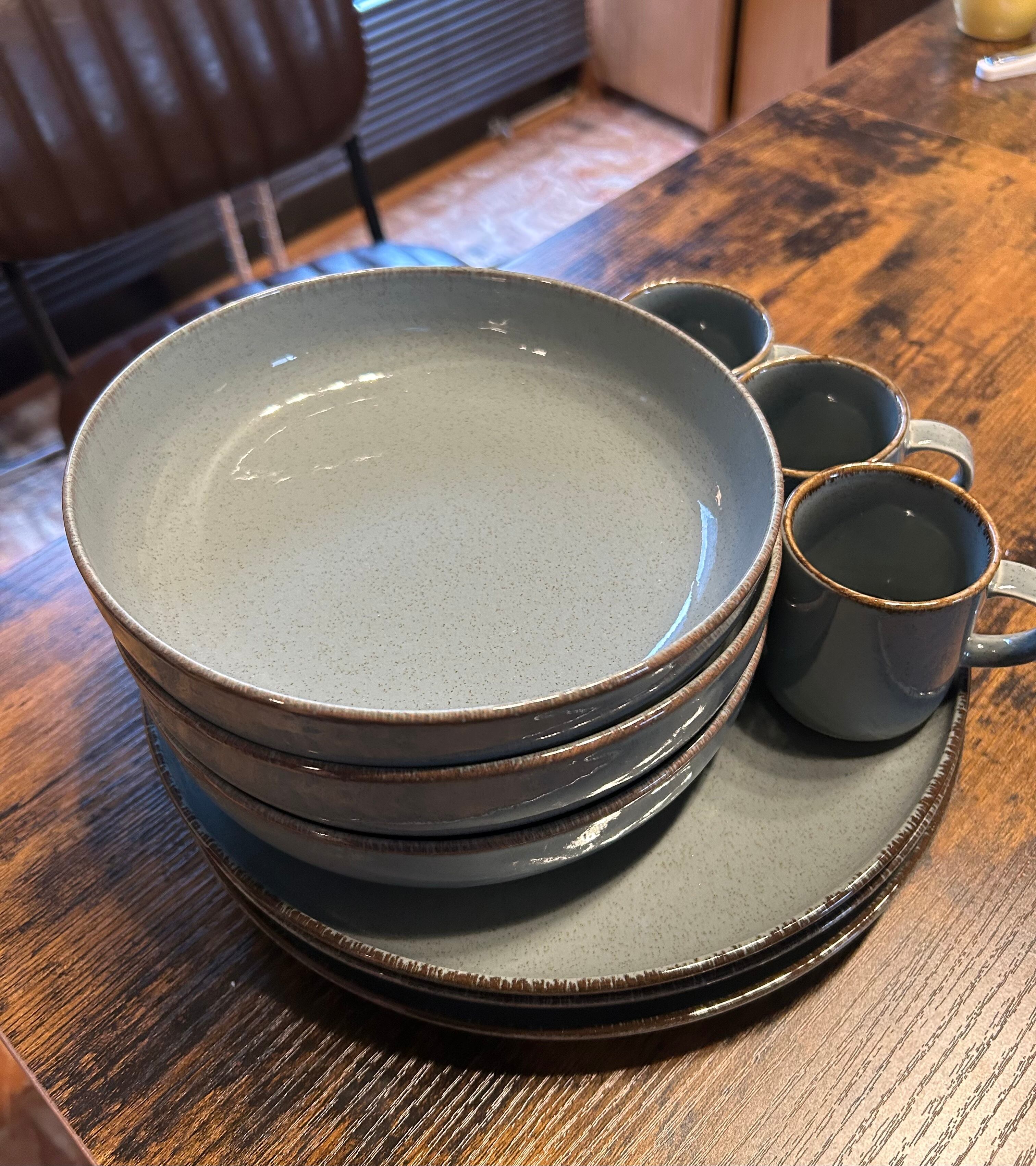 ポーセリン製のディナープレート、スーププレート、マグカップが各々1つずつ計9点、3人分のセット商品となります。