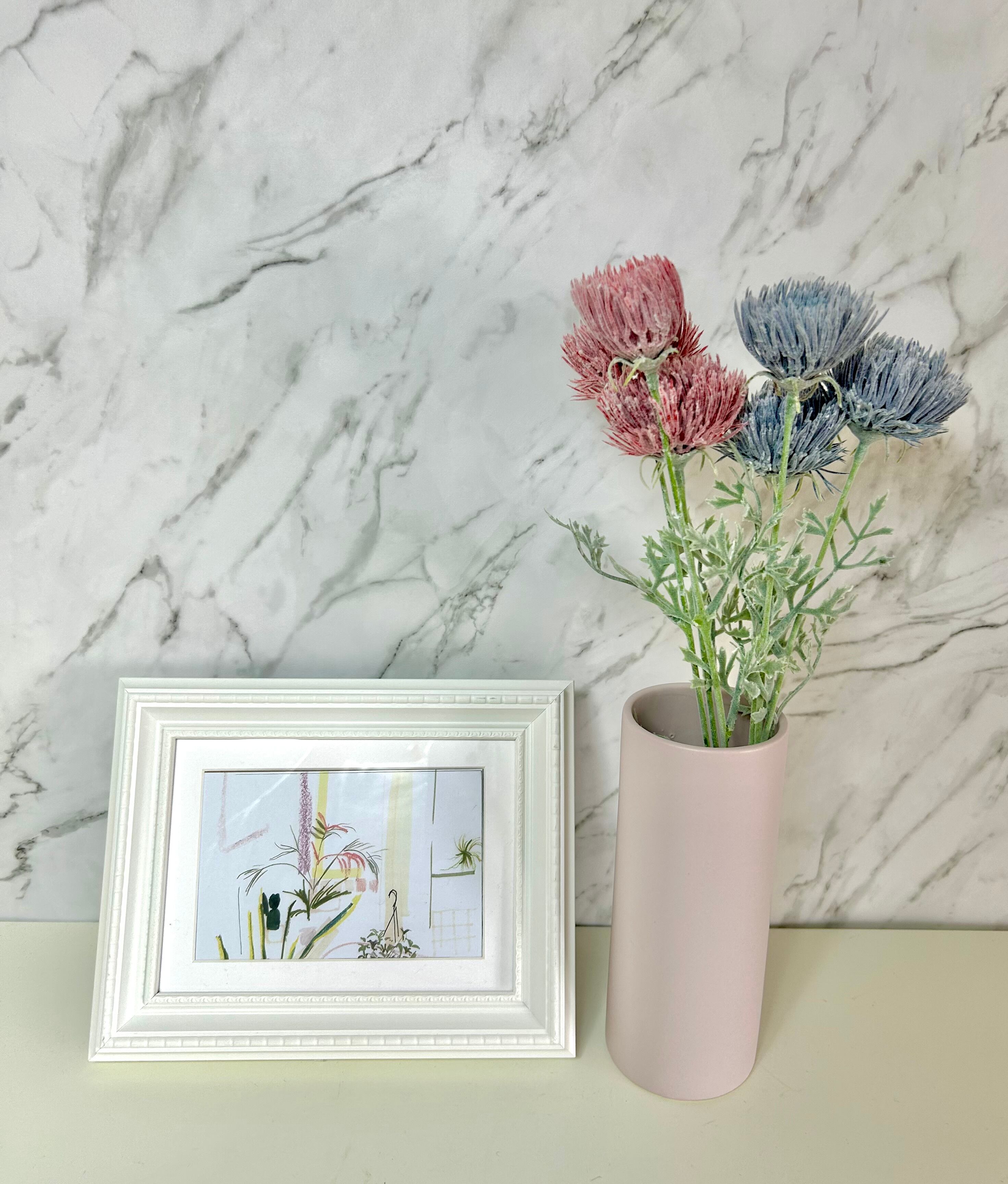 淡いピンクのフラワーベースはお花の鮮やかさを引き立てながら、優しい雰囲気をプラスしてくれます。