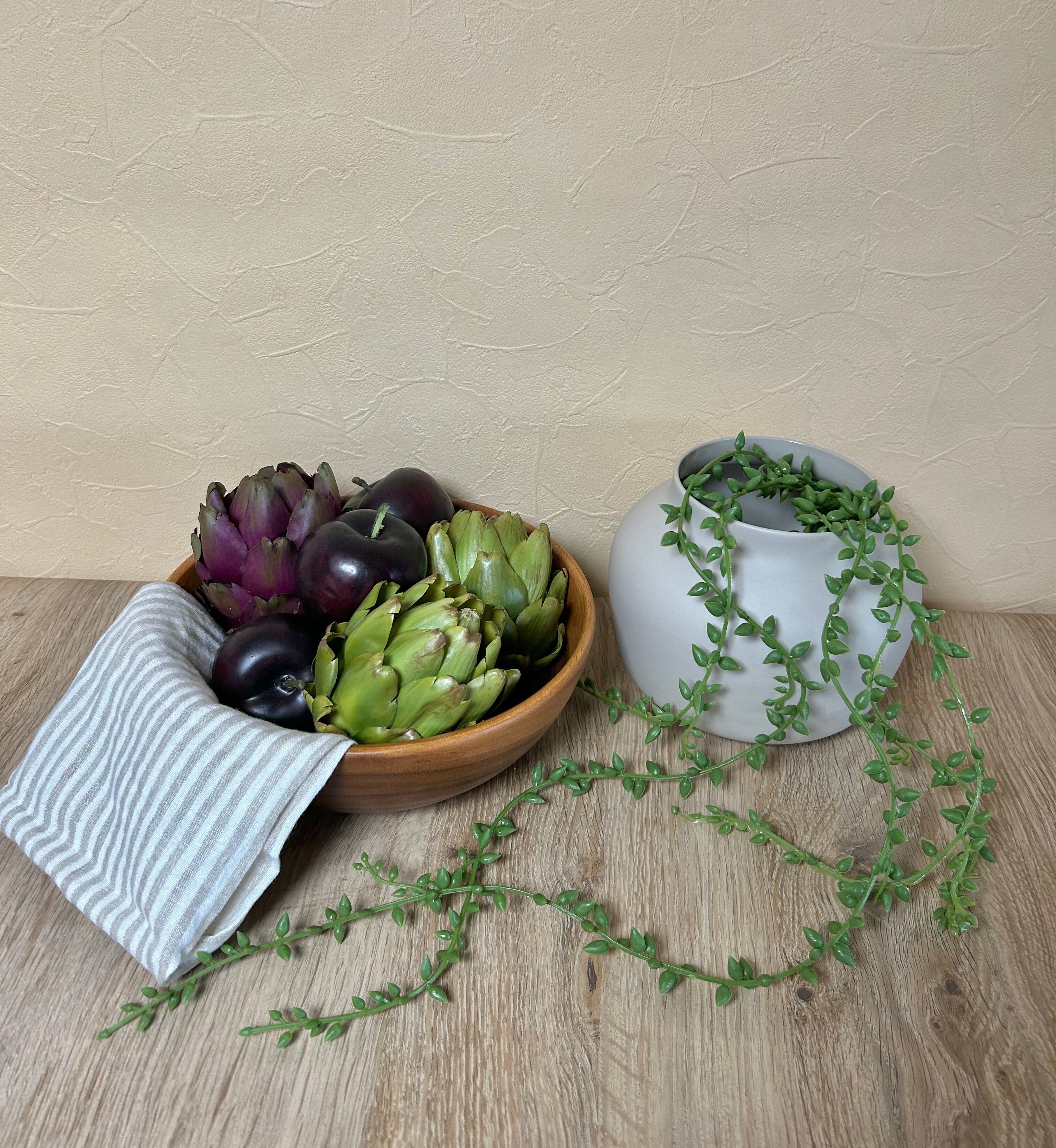 林檎のフェイクフード×3・アーティチョークのフェイクフード×3・ボウル・ナプキン・フラワーベース・アーティフィシャルグリーンの10点セット。