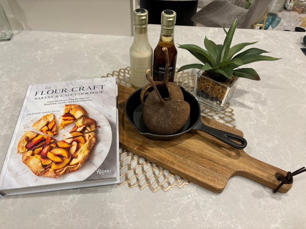 料理本、プレイスマット、カッティングボード、スキレット、ドレッシング×2、フェイクフード(いちじく)、アーティフィシャルグリーンの8点セット。